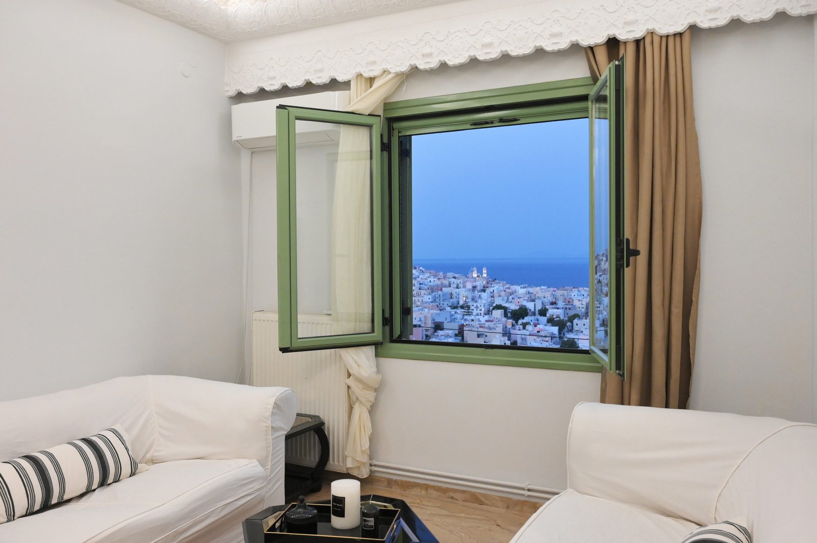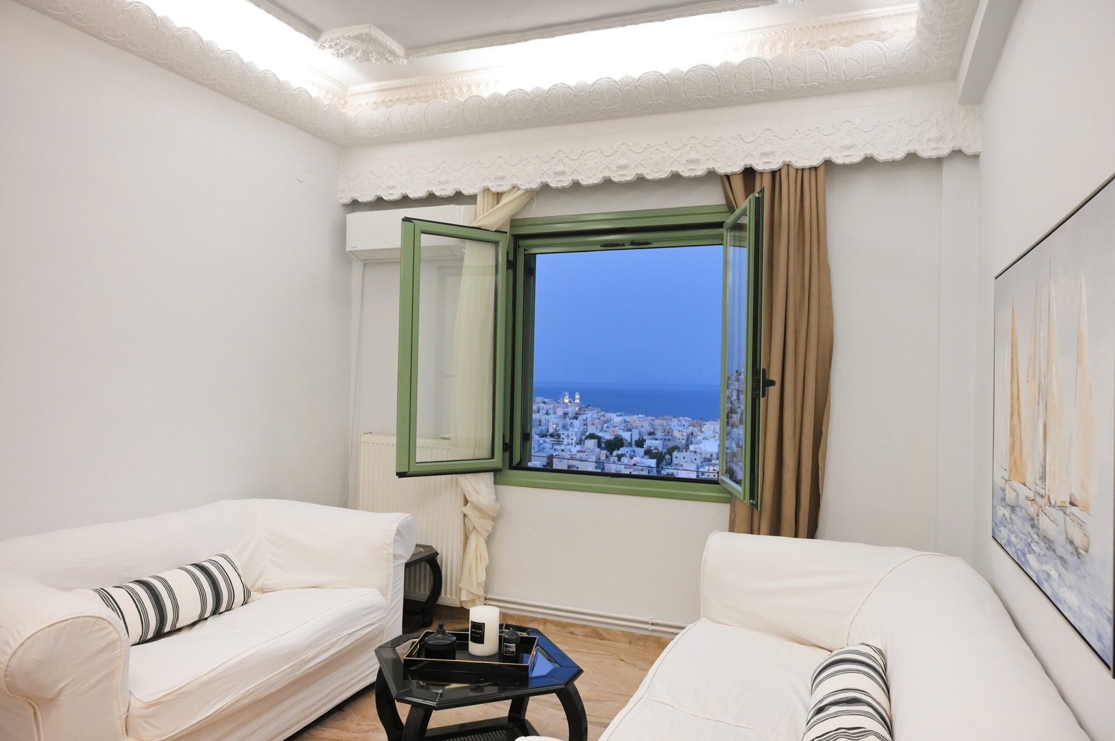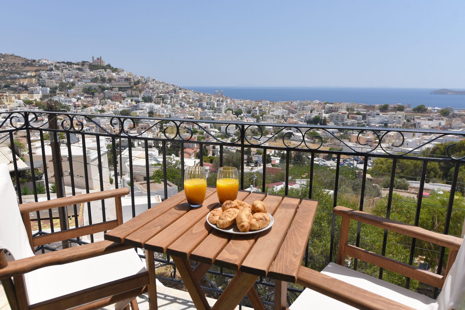 The apartment is located 1.5km from the port of Ermoupolis and 5′ by car from Miaouli Square, which is located at the City Hall of the City. It is located on a hill, with a stunning view of the whole of Ermoupolis. From the balconies one can see the churches, postcards of the island, The Orthodox Church of Resurrection and the Catholic church of St. George. It maintains the traditional neighborhood of the island. It has easy parking.